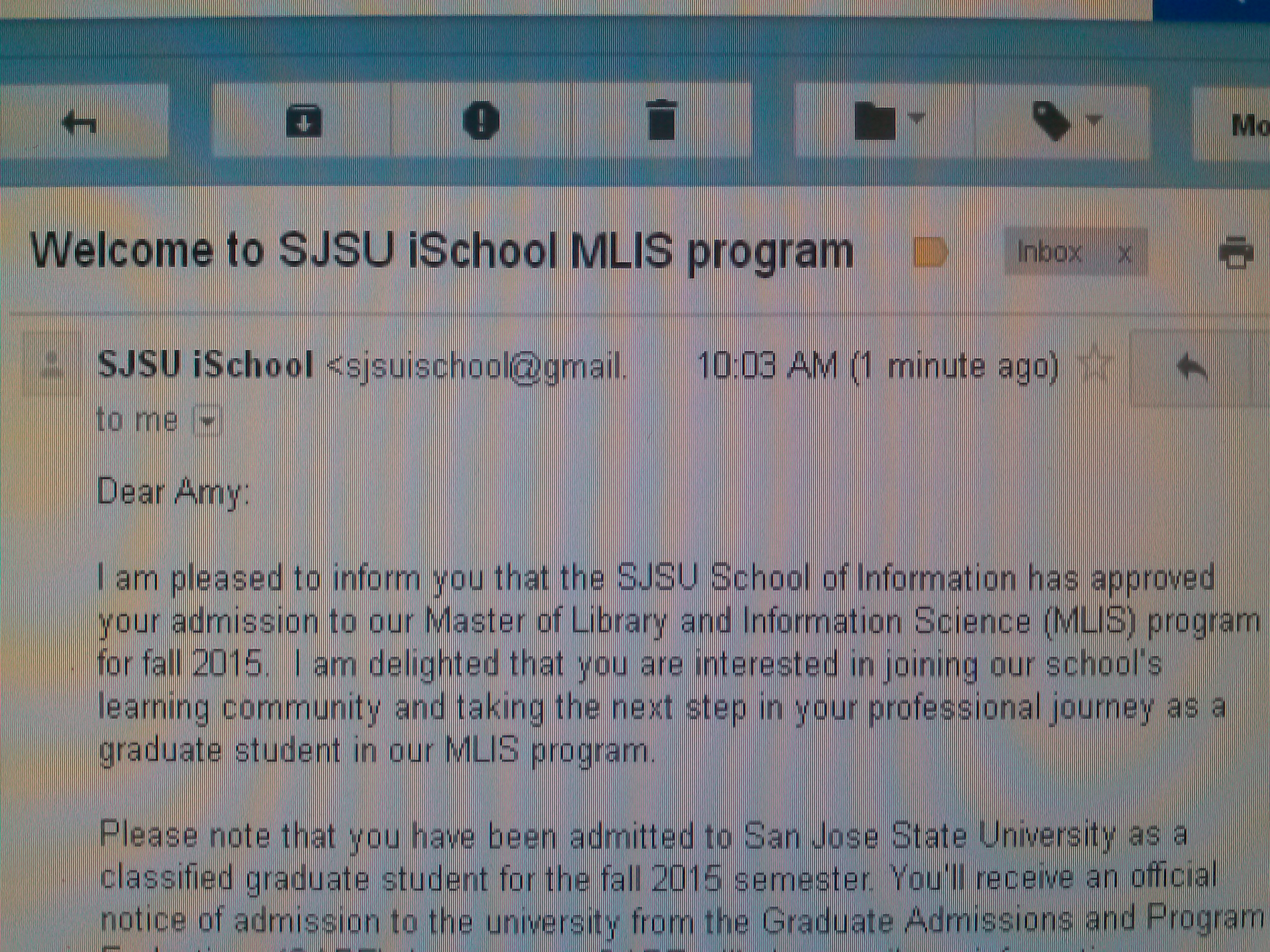 There was a space of about half an hour between when I logged in to the SJSU portal and saw the “Accepted” line on the admissions status screen, and when the official email came in, to get my head around it. I’ve had every reason to expect that this was coming for several weeks, and two weekends ago, I told a bunch of my friends that it was near enough to certain that I was organizing my life around starting classes in August.